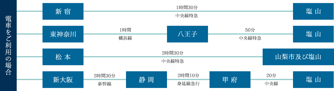 - ・名古屋より東名高速 富士I.Cから、富士宮有料道路―河口湖経由、塩山まで 40分